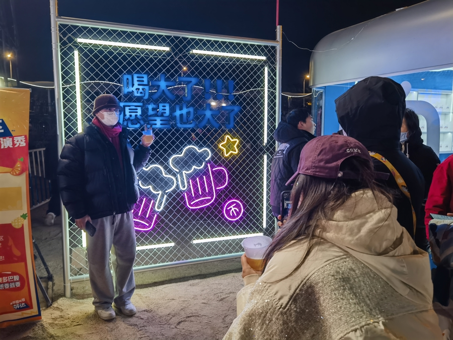 18时,已有四五千名年轻人从城市各处赶到现场,他们有些在美食区排队“干一杯”啤酒,有些在许愿区许下“钱包鼓鼓”“抢票必中”“成功上岸”等新年愿望,有些则忙着寻找各种造型的人物角色合影。